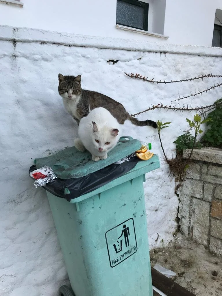 If you see cats at the bins please give them water, wet and/or dry food. Please do not put the food directly on the floor. Use a piece of cardboard, a plastic container or anything similar. If they eat the food of the floor, it could damage their teeth. Do not leave packaging from the cat food around the bins or other areas as this angers the locals.
